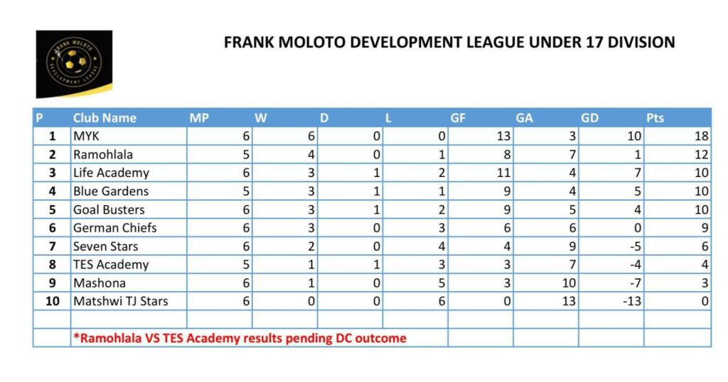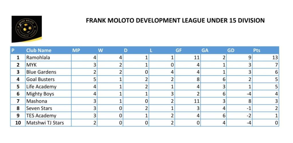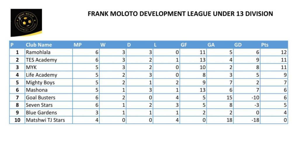 In the Under-13 division, Ramohlala Development remains unbeaten after six matches, recording three wins and three draws to collect 12 points. They are only one point ahead of TES Academy, who continue their tradition of being one of the strongest teams in the age group and currently occupy second place.
